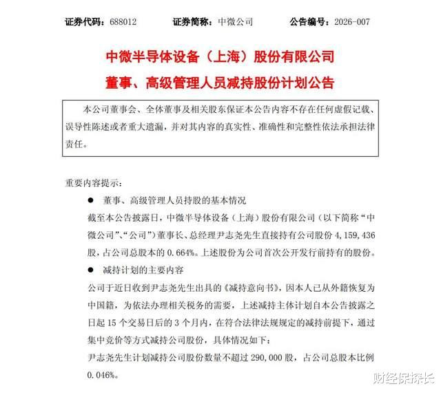 需特别注意的是,公告解释此次减持主要因其个人国籍状态发生变化(已从外籍恢复为中国籍),为依法办理相关税务事项所需。